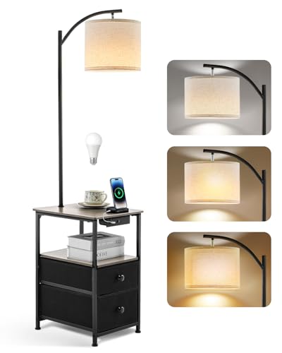 Wio-Mio Floor Lamp with 2 Drawers, Nightstand Lamp with USB & Type-C Charging Station, 3 Colour Temperature Standing Lamp with Adjustable Lampshade, LED Floor Lamp for Living Room and Bedroom