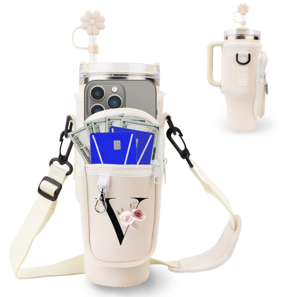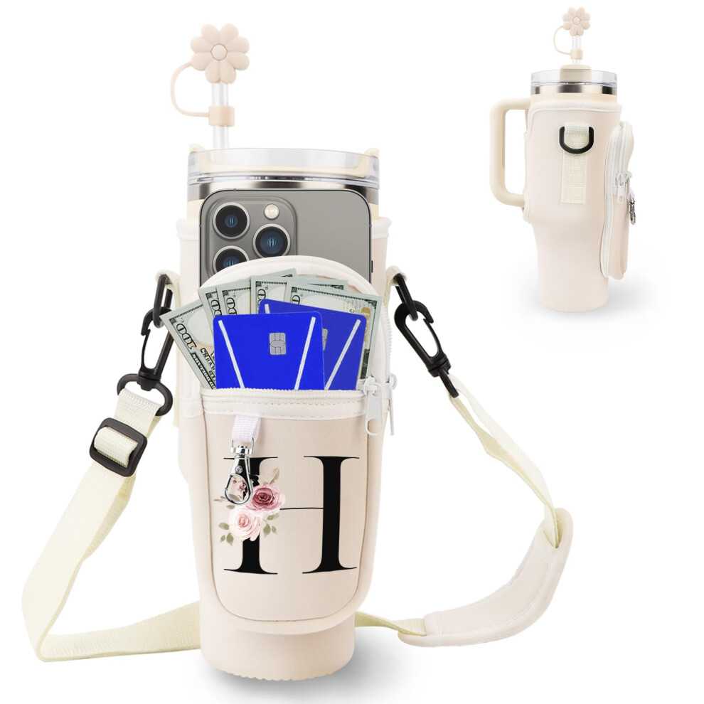 Initial Personalized Water Bottle Bag for Stanley 40oz Tumbler,with Phone Pocket,Neoprene Water Bottle Carrier with Adjustable Strap and Straw Cover &