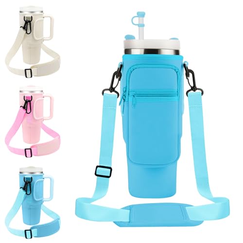 EOAMGO Stanley Cup Bag 40oz, Water Bottle Bag with Phone Pocket & Adjustable Shoulder Strap, Stanley Cup Holder with Straw Cover for Walking Travel (Blue, 40oz)