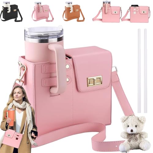 Stanley Cup Bag, Cup Accessories Holder with Adjustable Strap & Phone Pocket for Bottles, 40oz Tumbler for Walking and Hiking (Pink Bag + Straw Stopper)