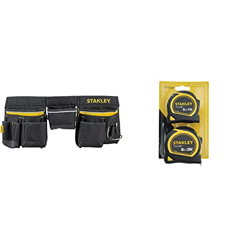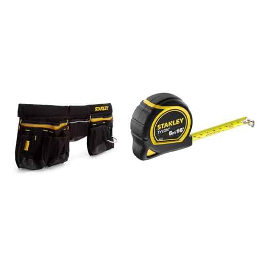 STANLEY 600 Denier Tool Belt Pouch with Multi-Pockets Storage Organiser, Tape Pocket, Hammer Loop & Tylon Tape Measure 5M/16 Inches Compact Case with Cushioned Grip Metric and Imperial System