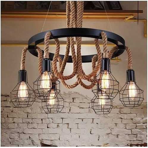 ZXQUEGF 5 Light Farmhouse Chandelier Rustic Round Hanging Pendant Light Hemp Rope Industrial Island Light Vintage Metal Black Ceiling Lamp for Dining Room Living Room Bedroom Kitchen Bar Star of Light
