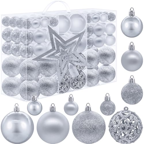 101 Pieces Christmas Baubles Set Xmas Ornaments Christmas Tree Plastic Baubles for Seasonal Decoration with 1 Star Tree Topper, Shatterproof Xmas Hanging Balls for Holiday Party, Silver