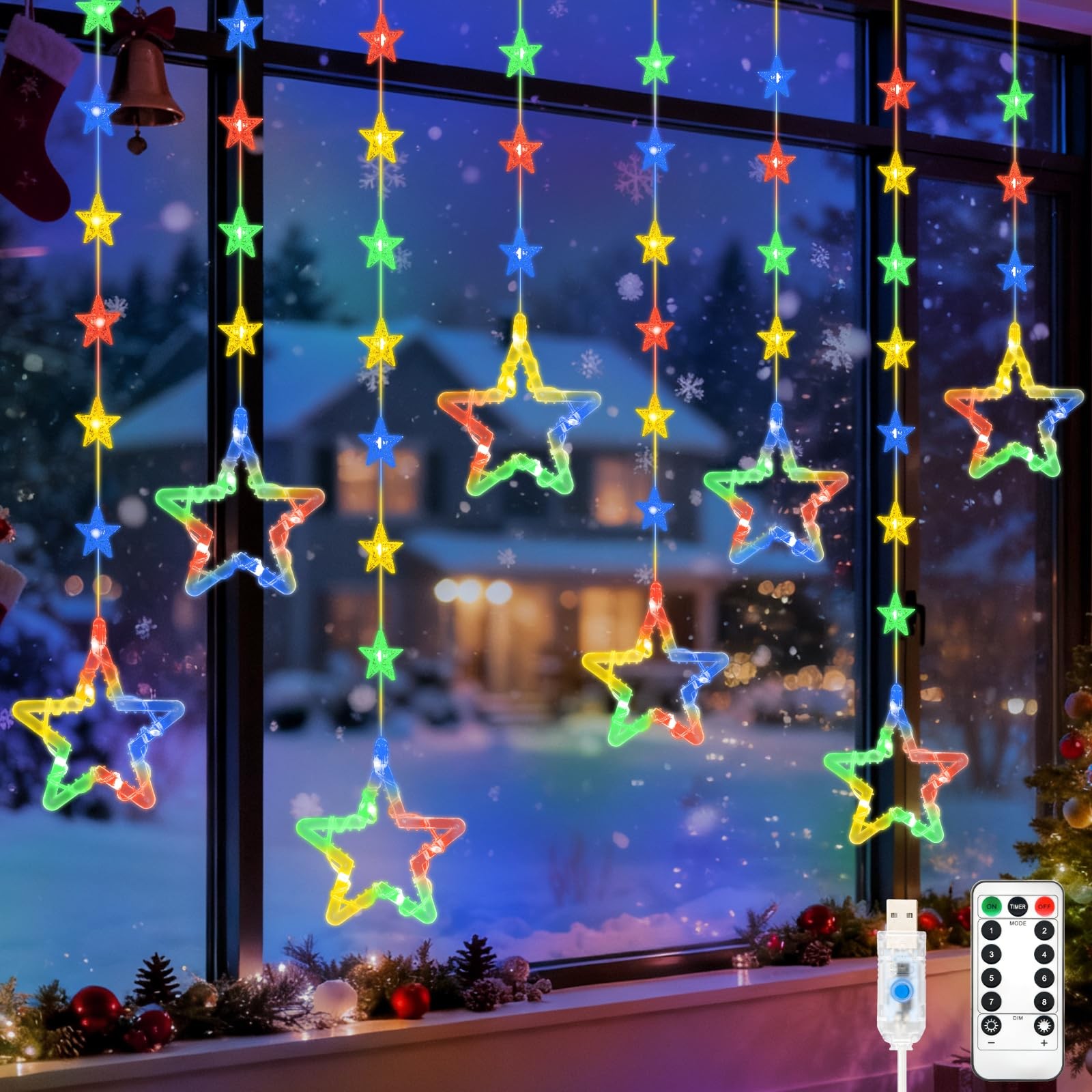 Gcstnn Christmas Star Window Lights, 2M 48 Stars Multicoloured Curtain String Lights USB Powered with Remote Control Timer Waterproof Hanging Christmas Light for Window Bedroom Xmas Tree Decorations