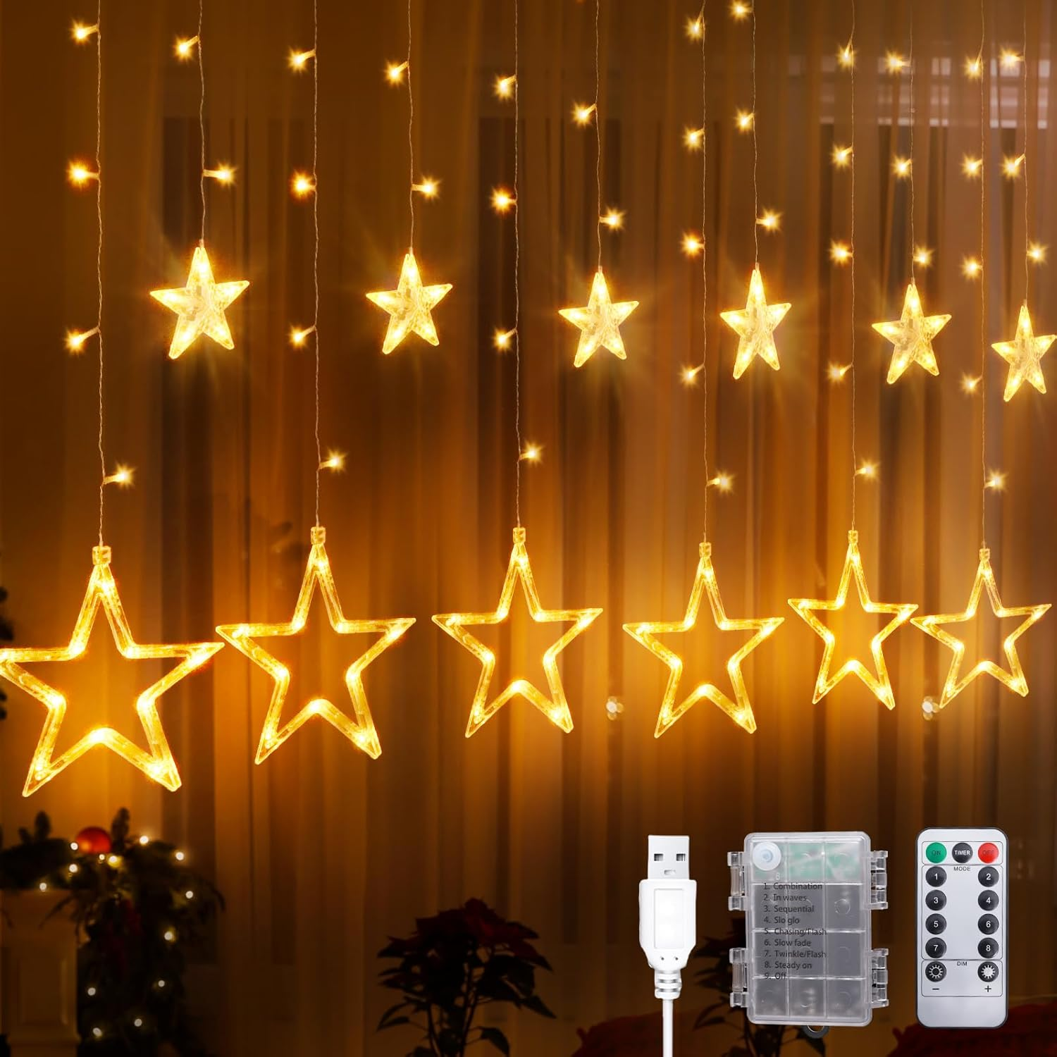Gcstnn Christmas Star Window Lights, 2M 48 Stars Warm White Curtain String Lights USB Powered with Remote Control Timer, Waterproof Hanging Christmas Light for Window, Bedroom, Xmas Tree Decorations