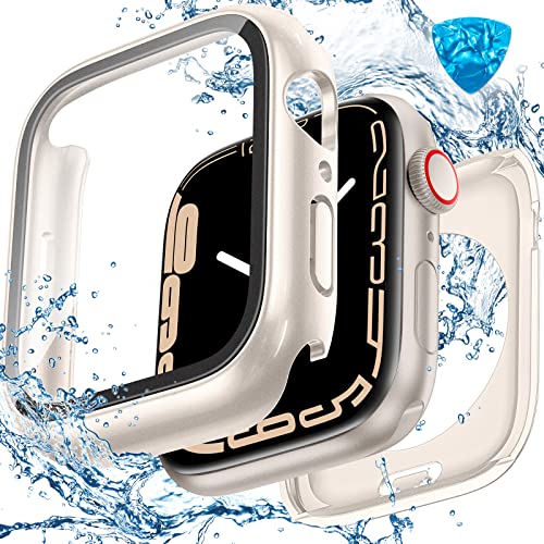 HWeggo [2 in 1 Waterproof Case for Apple Watch Series 9/8/7 Screen Protector 41mm,360 Protective PC Cover with Tempered Glass,Front & Back Bumper (Starlight)