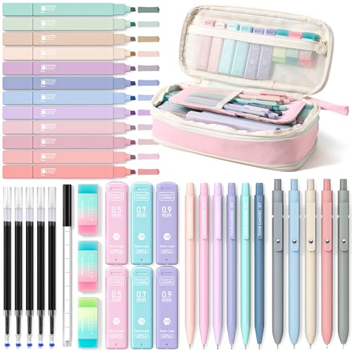 DazSpirit 61 PCS Aesthetic Stationery Supplies with Pencil Case, 12 Pastel Highlighters, 4 Erasable Pens, 5 Gel Pens, 6 Mechanical Pencils, Stationary Set for Students, Note-taking & Journaling (Pink)