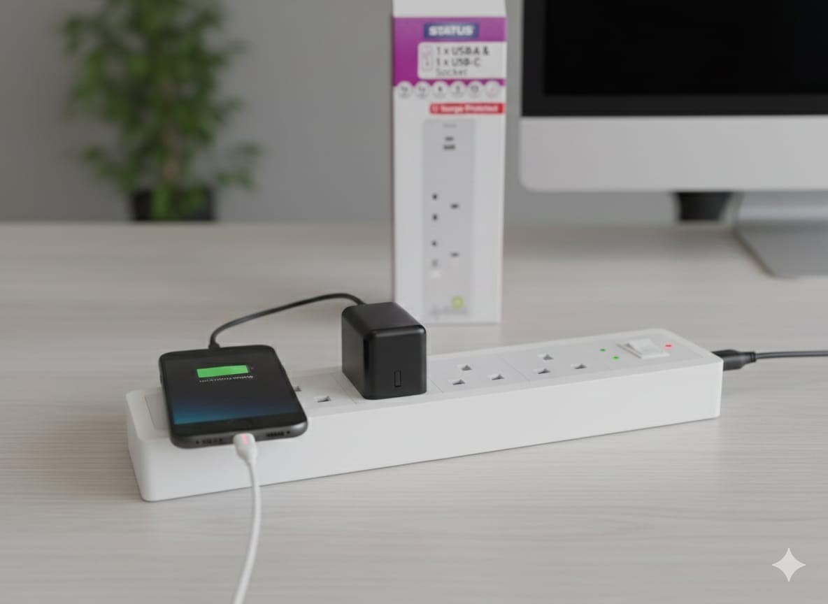 STATUS Multi Plug Extension | 2 Socket Extension Cable with 1 USB and 1 USB-C Charging Port | 1.5m Extension Lead | S2W2USBACBC1PK4