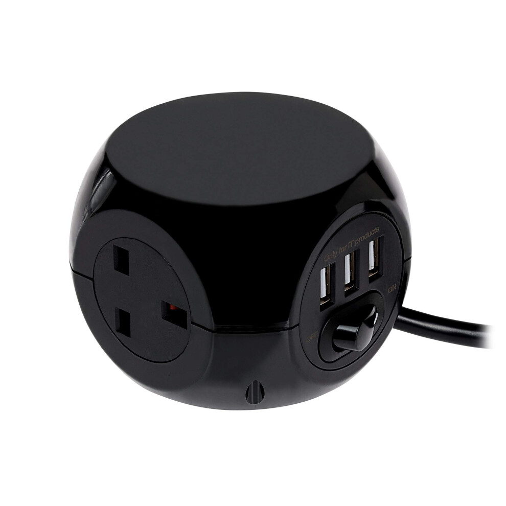 Status 3 Way Cube Socket with 3 USB Ports, Black Compact Extension Adapter with 1.4 Metre Lead for Home Office Travel Use, Space Saving Power Block,