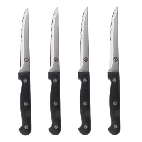 MasterChef Steak Knives Set of 4, Hand Sharpened, Serrated Stainless Steel Blades measure 11cm (4.5in) with Traditional Black Triple Riveted Comfort Grip Handles, Dishwasher Safe 4pc Steak Knife Set