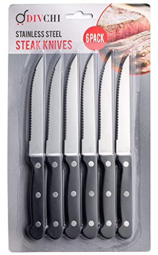 DIVCHI Steak Knives Set of 6 - Serrated Stainless Dinner Knives - Dishwasher Safe