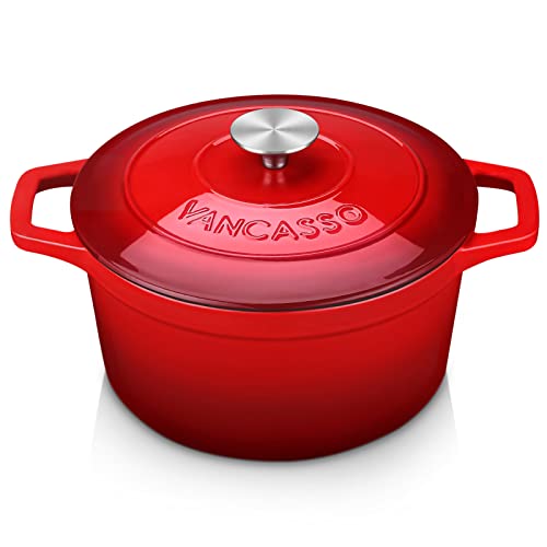 vancasso Dutch Oven, 24cm/4 Liters Classic Round Cast Iron Pot, with Stainless Steel Knob Lid Heavy Duty Enameled Cast Iron Casserole for Steam Braise Bake Broil Saute Roast - Red