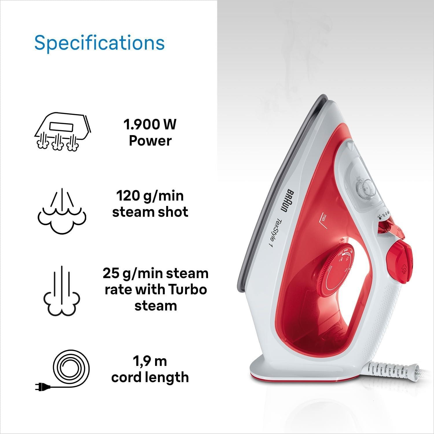 Braun TexStyle 1 Steam Iron Non-Stick Coating 1900W 220ml Water Tank - Red/White