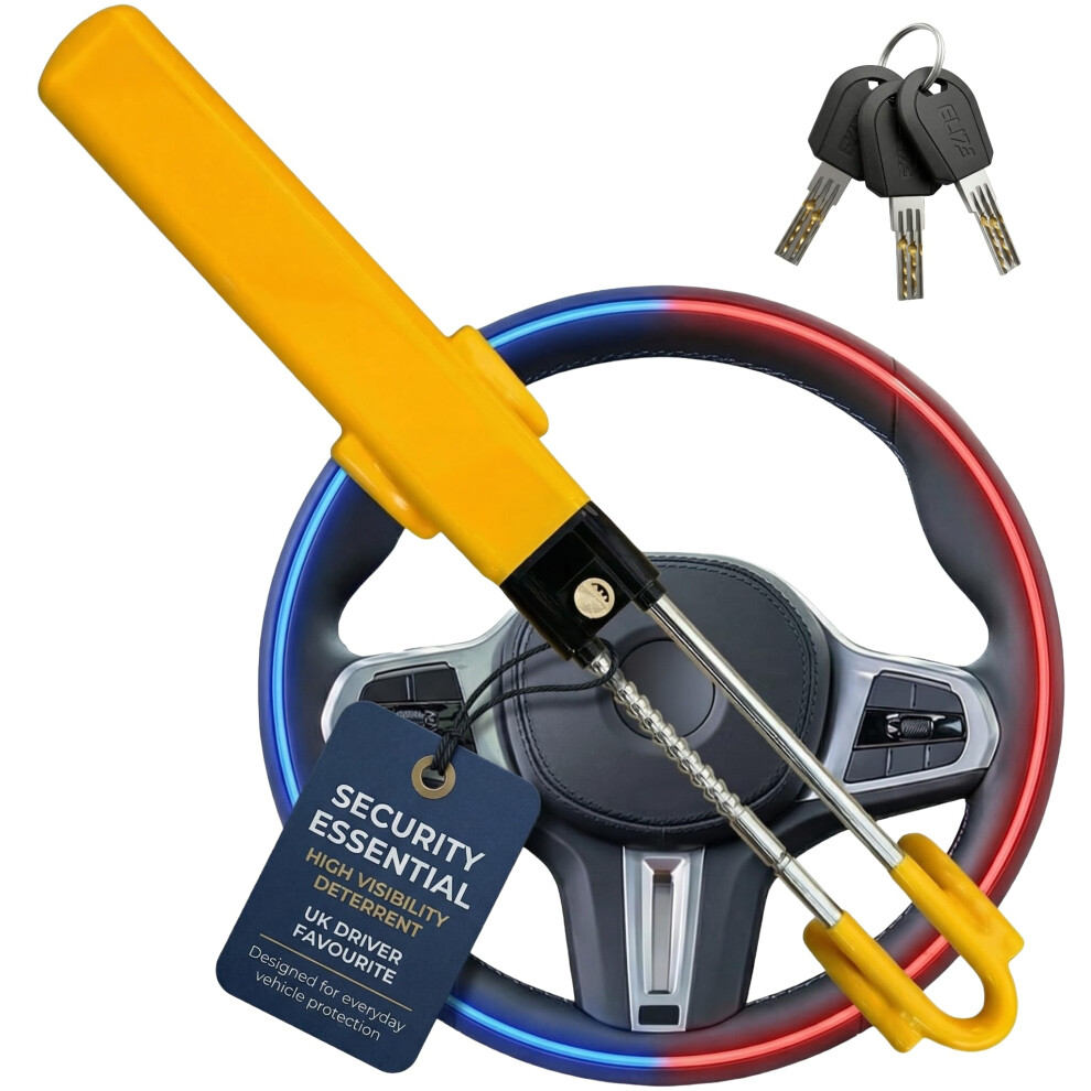 Steering Wheel Lock Twin Bar, Steering Lock, Stop Thieves Stealing Your Car, Car Steering Wheel Locks, Anti-Theft Device, Universal Fit, High Visibility, Adjustable Length, 3 Keys (Yellow)