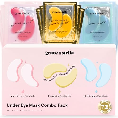 Under Eye Mask - Reduce Dark Circles, Puffy Eyes, Undereye Bags, Wrinkles - Gel Under Eye Patches, Vegan Cruelty-Free Self Care by grace and stella (72 Pairs, GoldPinkBlue)