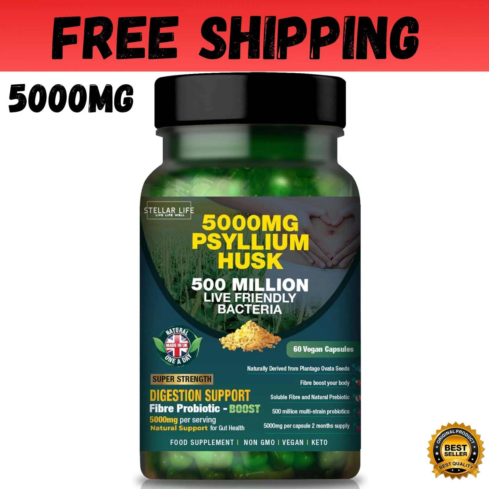 Fibre Supplement 5000mg Psyllium Husk with 500 Million Multi-Strain Probiotic - High Strength - Natural Soluble Fiber Supplement Plantago Ovata Seeds 2 Month Supply Psyllium Husks Capsules Vegan, UK