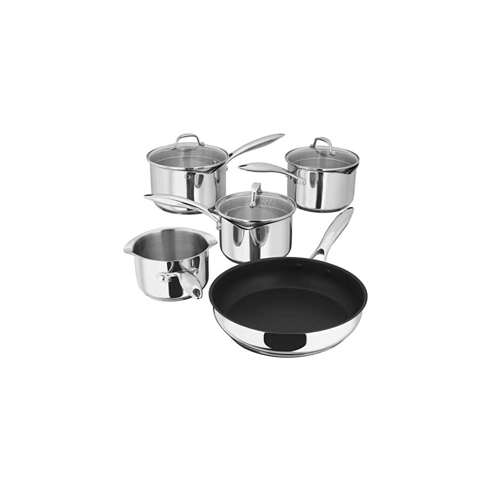 Stellar PP374 5-Piece Set of Stainless Steel Pans 16cm, 18cm & 20cm Draining Saucepans with Strainer Lids, Teflon Non Stick Frying Pan 26cm and Milk