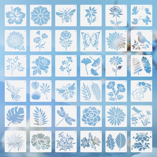 EXCEART Flower Stencils for Painting: 36 Sheets Sunflower Butterfly Bird Leaves Bee Stencils for Crafts Reusable - Plastic Painting Templates for Wood, Canvas, Wall, Fence, Furniture, Card Making