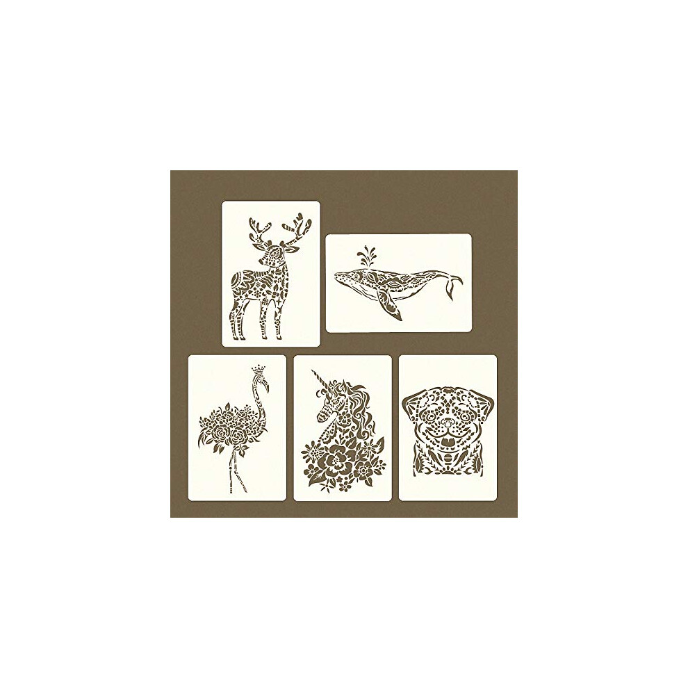 Lion Deer Tiger Wolf Whale Horse Animal Stencils for Painting on Wood Fabric Walls Airbrush + More Reusable Mylar Template 8.2""""11.4""""(Pack of 5)
