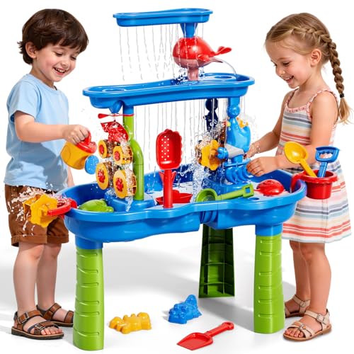 DULONIME Sand and Water Table Toys for Kids Aged 3 4 5 6 7 8, Water Waterfall Sensory Play Table with Beach Toys Accessories, Outdoor Activity Playset for Toddlers 2-4 3-5 4-6, Birthday Gifts