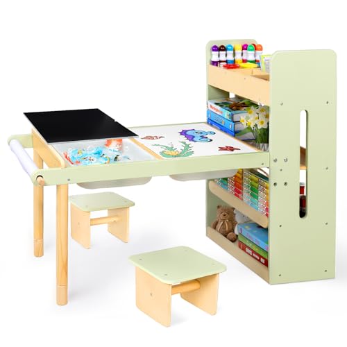 LOL-FUN Kids Sensory Table and 2 Chairs Set with Storage Bins & Shelves, Toddler Activity Table with Blackboard and Whiteboard, Children’s Art Table for Drawing, Sand and Water Play Ages 3-8