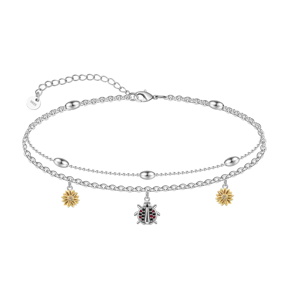 CHIC & ARTSY 925 Sterling Silver Ladybug Ankle Bracelet Cute Double Layer Sunflower Insect Charm Anklet Bracelets for Women