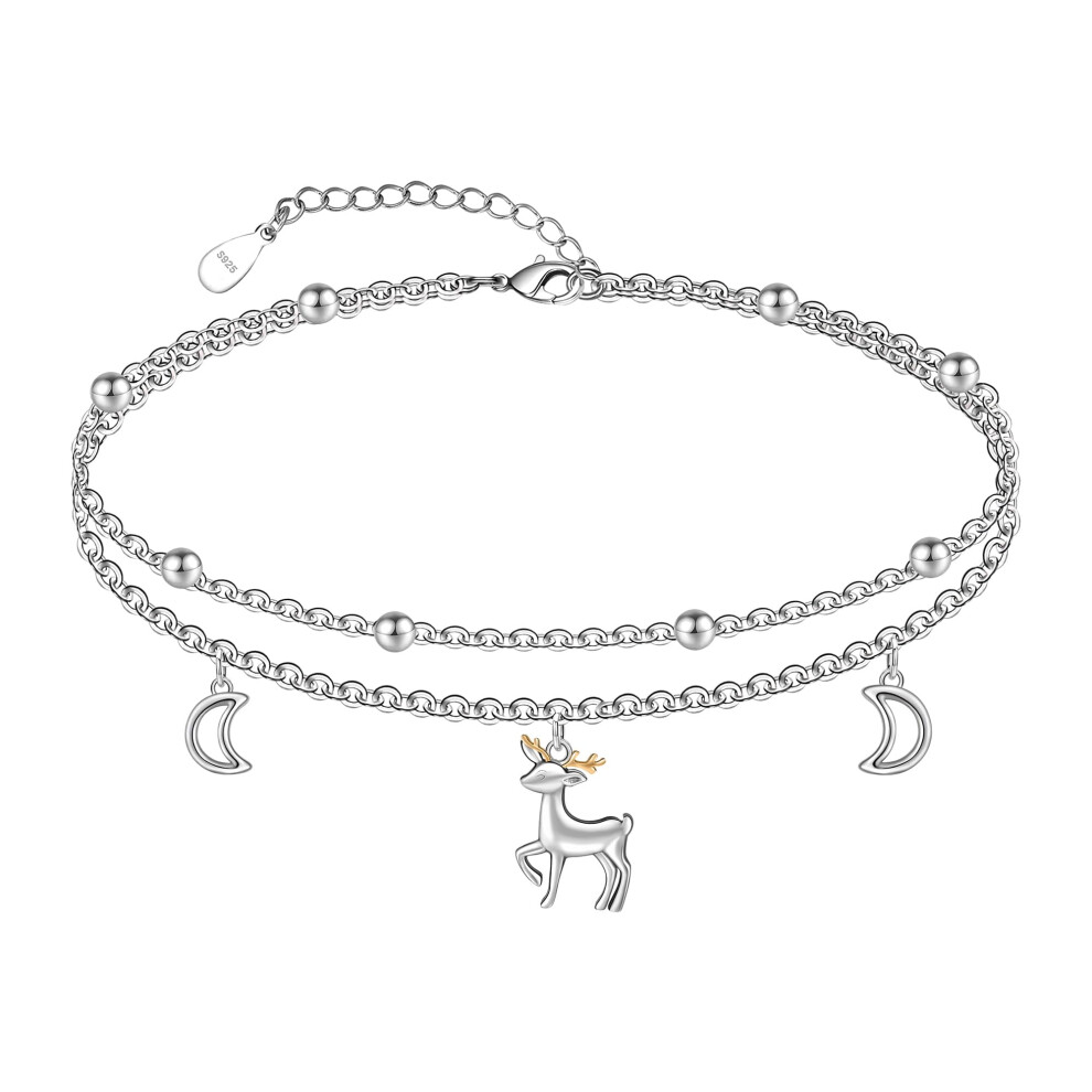 CHIC & ARTSY Sterling Silver Ankle Bracelet - Hypoallergenic Cute Deer Anklets for Women - White Gold Layered Adjustable Animal Link Anklet Jewelry