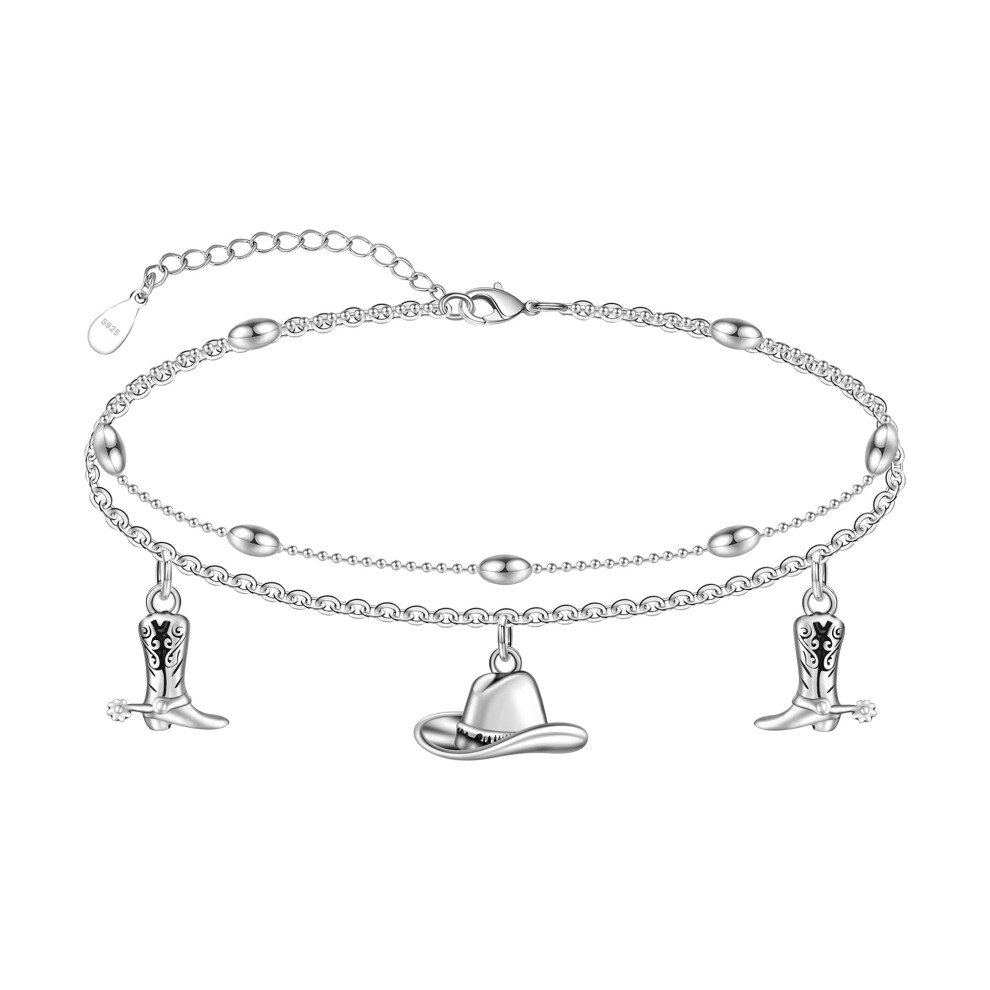925 Sterling Silver Cowboy Hat Ankle Bracelet for Women, Adjustable Dainty Layered Boot Anklet Jewelry
