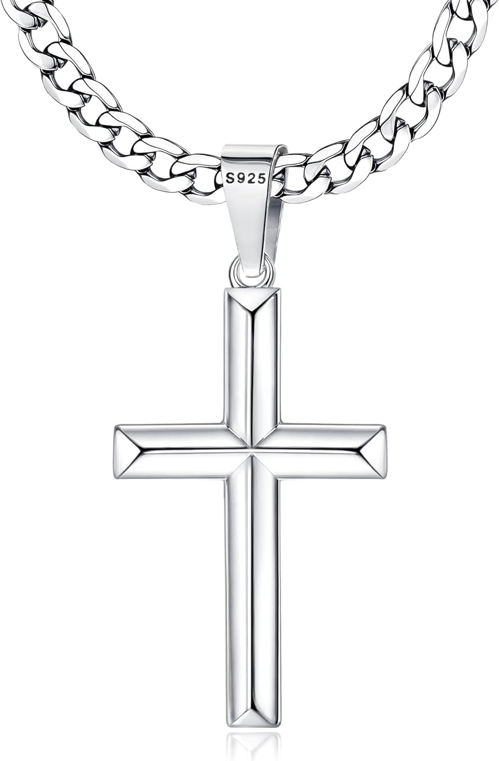 Chriscoco 925 Sterling Silver Cross Pendant Necklace for Men Women 5mm Stainless Steel Diamond-Cut Durable Cuban Link Chain Crucifix Necklace Polished Beveled Edge Cross Chain Necklace Jewelry