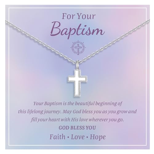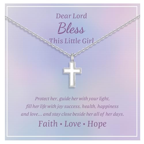 Sterling Silver Cross Necklace for Kids - Dainty Cross Pendant Necklace Christening Gift for Godchild, Easter First Communion Confirmation Baptism Gifts for Boys Girls (Girl's Baptism, Silver)