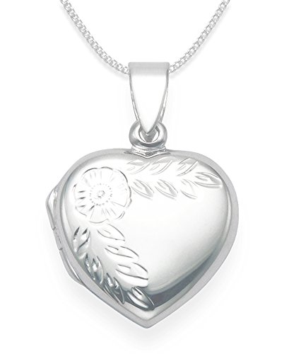 925 Sterling Silver Heart Locket Necklace with flower engraving on 16" curb chain 3gms - SIZE: 17mm x 17mm. Gift boxed 8021