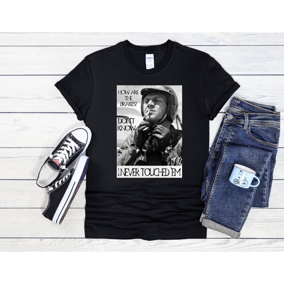 (Medium, Black) Steve McQueen How Are The Brakes Never Touched 'Em Men Women Unisex Top T Shirt
