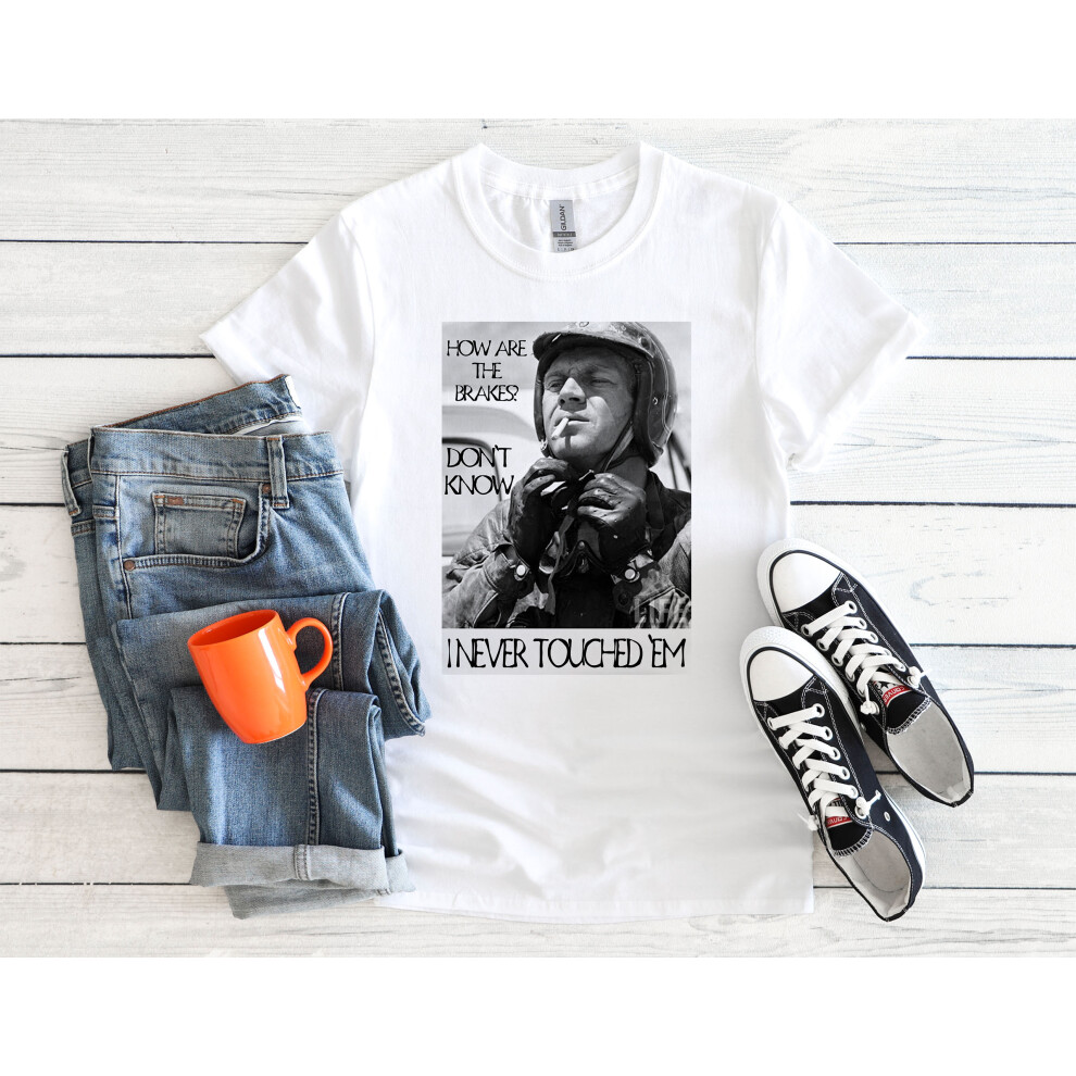 (Medium, White) Steve McQueen How Are The Brakes Never Touched 'Em Men Women Unisex Top T Shirt