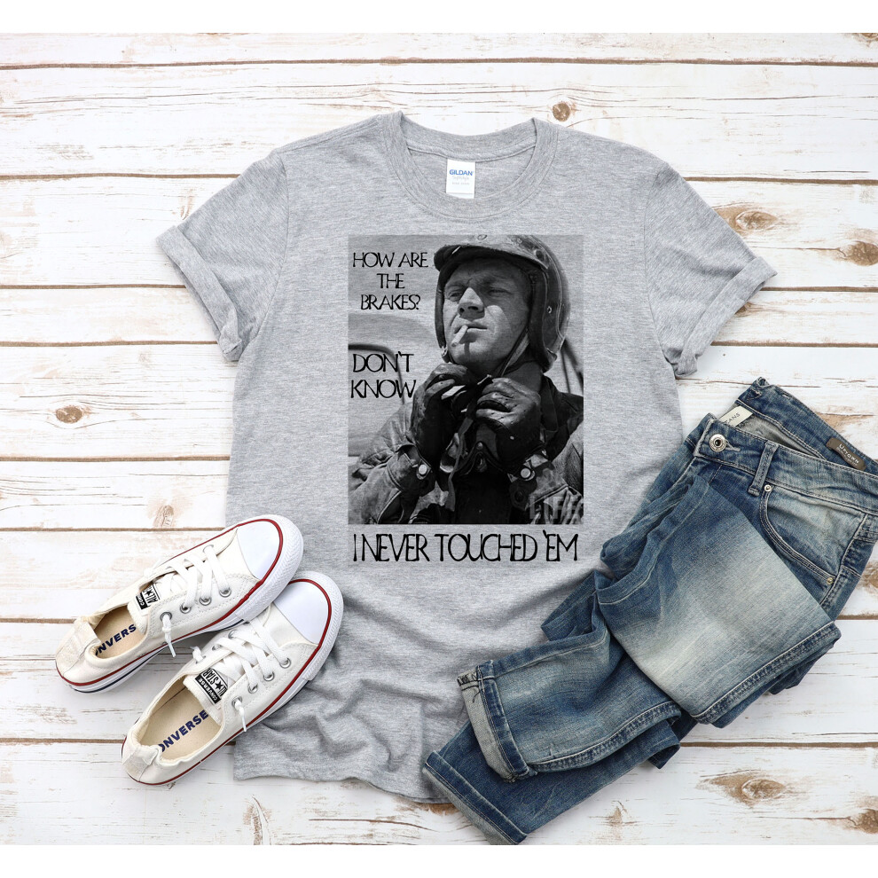 (Small, Grey) Steve McQueen How Are The Brakes Never Touched 'Em Men Women Unisex Top T Shirt