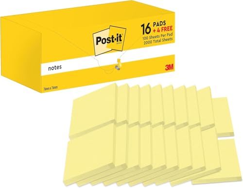 Post-it Notes Canary Yellow, Value Pack - 20 Pads, 100 Sheets per Pad, 76 mm x 76 mm, Canary Yellow - Self-Stick Notes for Note Taking, to Do Lists & Reminders, School and Office Supplies