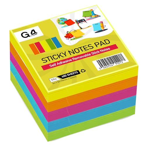 G4GADGET Sticky Notes Cube 400 Sheets - 76x76mm Neon Colors - Self-Stick Notes for Reminders, to-Do Lists & Messages - Strong Adhesive, Repositionable Sticky Notepads for Home, Office & School (1)