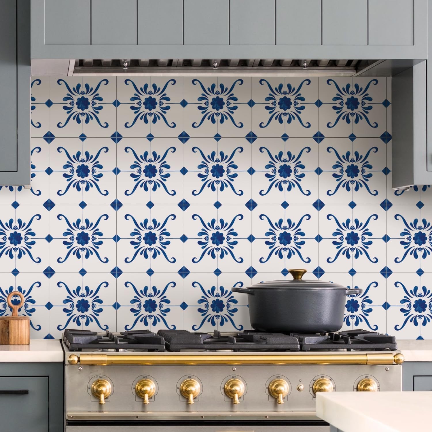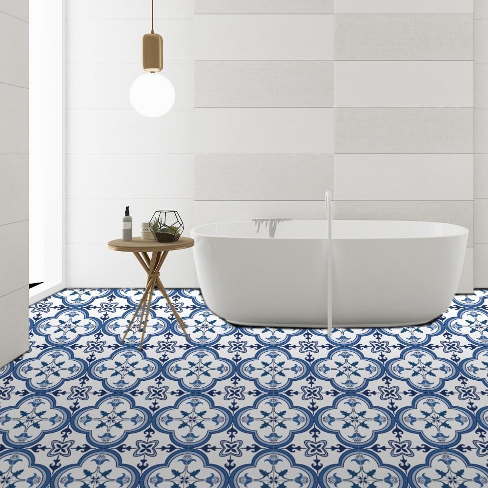 Alwayspon Tile Sticker, White and Blue China Self Adhesive Stick on Floor Tiles