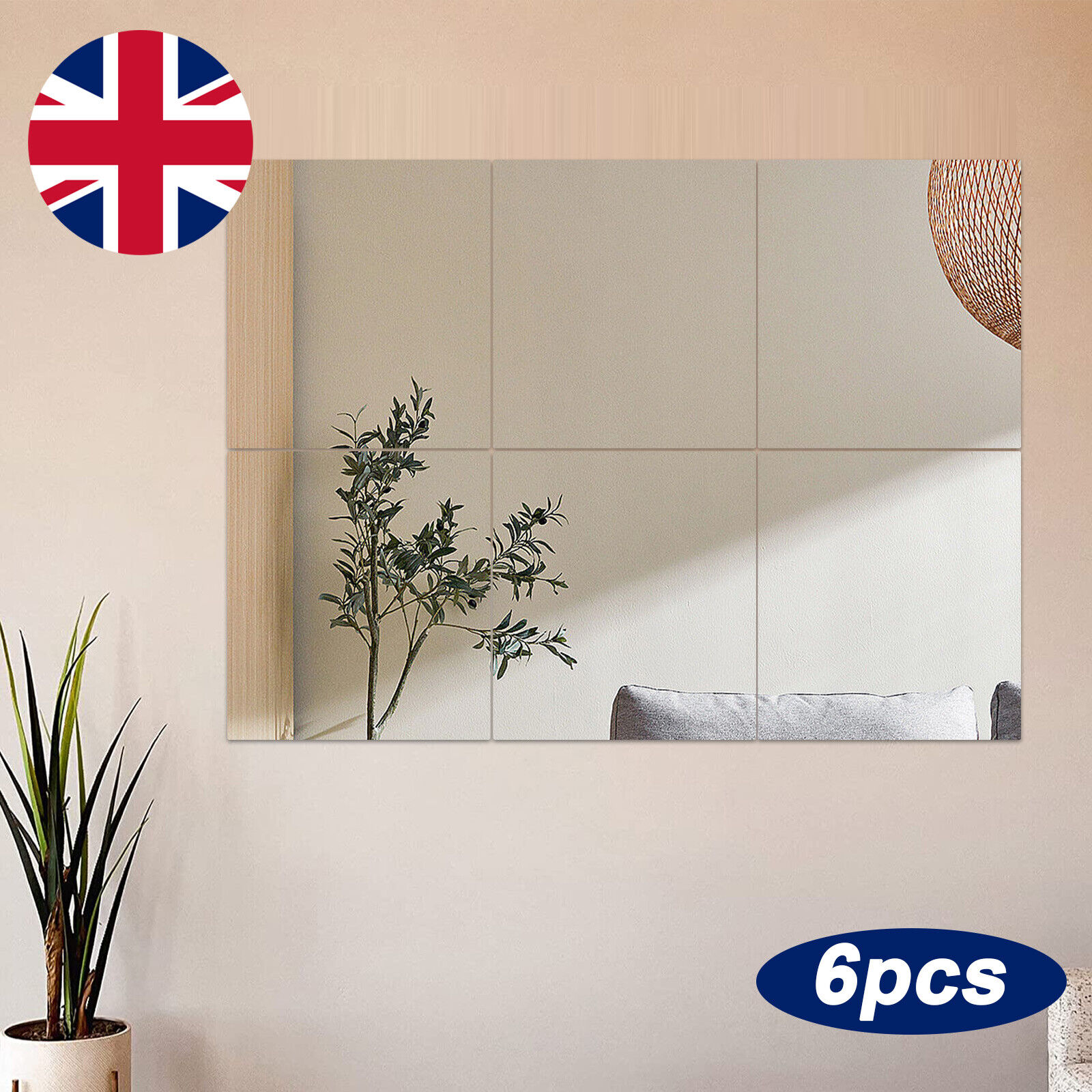 Set of 6 Glass Mirror Tiles 20 x 20cm Square Self Adhesive Stick On Panels DIY
