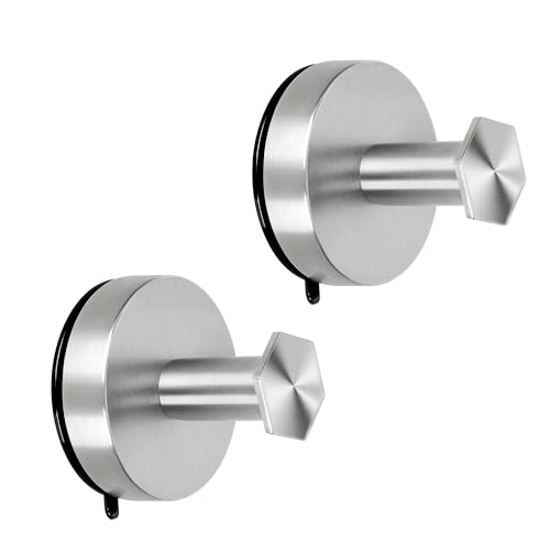 Mooche 2PCS Vacuum Suction Cup Hooks, Reusable Shower Suction Towel Hooks Stick on Glass Window, Mirror, Smooth Tiles, Waterproof Stainless Steel Sucker Hooks Hanger, Brushed Finished