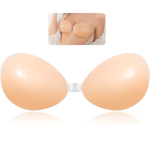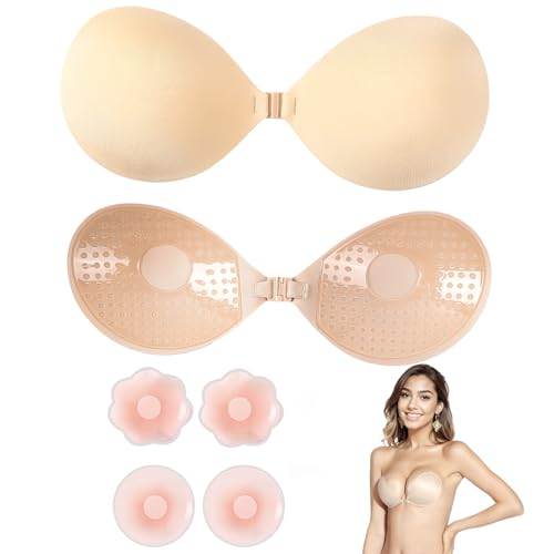 ANGELEMM Invisible Sticky Bra Push Up - Stick On Bras for Women, Reusable Women's Adhesive Bras, Strapless Backless Silicone Bra with 4 Nipple Covers for Party Dress (D Cup) Beige