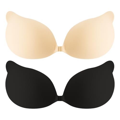 2 Pairs Invisible Bra, Stick on Bra Cups,Rabbit Shaped Sticky Bra Push up, Stick On Bra Push Up,Adhesive Bra, Reusable Bra Stick On Bra, Dackless Bras for Women, for Party, Weddings(Black, Nude)
