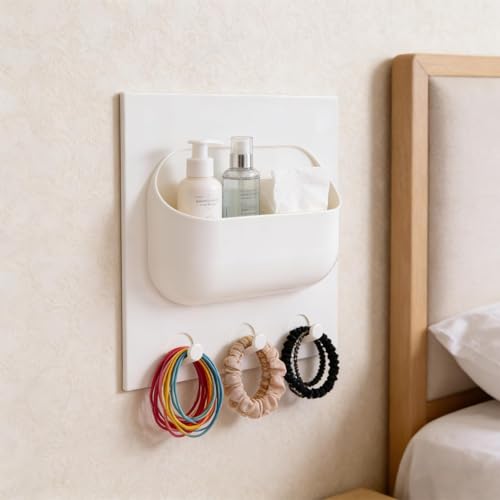 Punorric Bedside Shelf - Stick on Shelves, Floating Bedside Organiser & Wall Mounted Storage with Cable Hole, Shower Caddy, Key Holder, White Bedroom Shelves for Walls for Phone, Keys, Toiletries