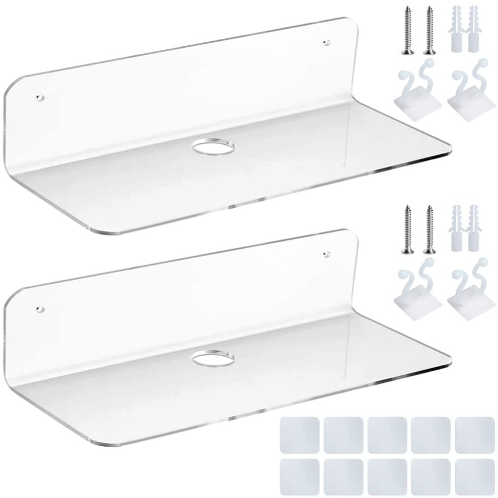 WeeGoo 2 Pcs Acrylic Floating Wall Shelf Self Adhesive 9 Inch No Drill Shelves Small, Stick on Shelves Damage Free Expand Wall Space, Clear Small Wall Shelf with Cable Clips and Stick on