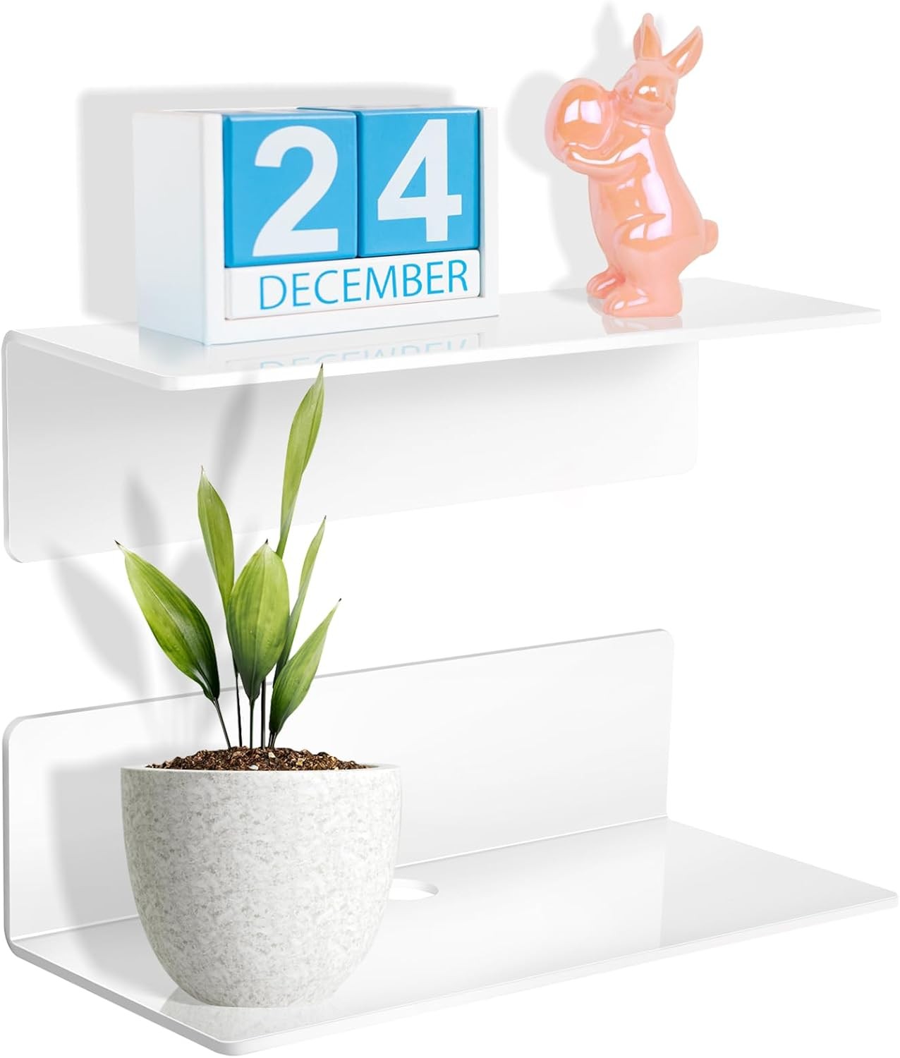 Floating Shelves for Wall, Stick On White Shelves, No Drill Self Adhesive Acrylic Wall Mounted Shelves for Display in Living Room, Bedroom, Bathroom, Kids’ Room, Office, Caravan, Set of 2 (23 × 10 cm)