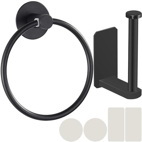 Tahbarshi Self Adhesive Toilet Paper Roll Holder and Hand Towel Ring Set for Bathroom - 304 Stainless Steel with Matte Black Finish - No Drilling Easy Stick On Installation