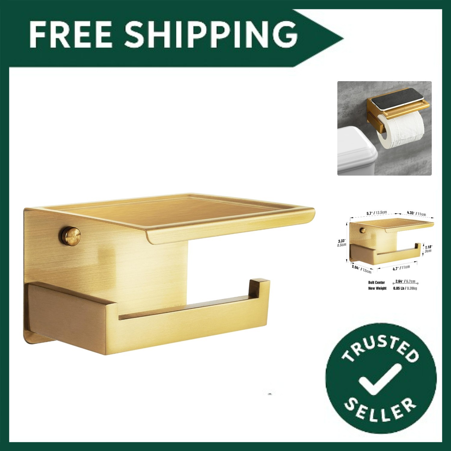 Brushed Gold Toilet Roll Holder with Phone Shelf, Stick on Brass Toilet Paper...