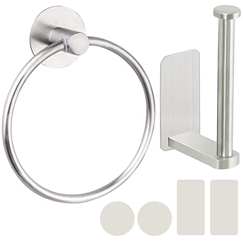 Tahbarshi Self Adhesive Toilet Paper Roll Holder and Hand Towel Ring Set for Bathroom - 304 Stainless Steel with Brushed Nickel Finish - No Drilling Easy Stick On Installation