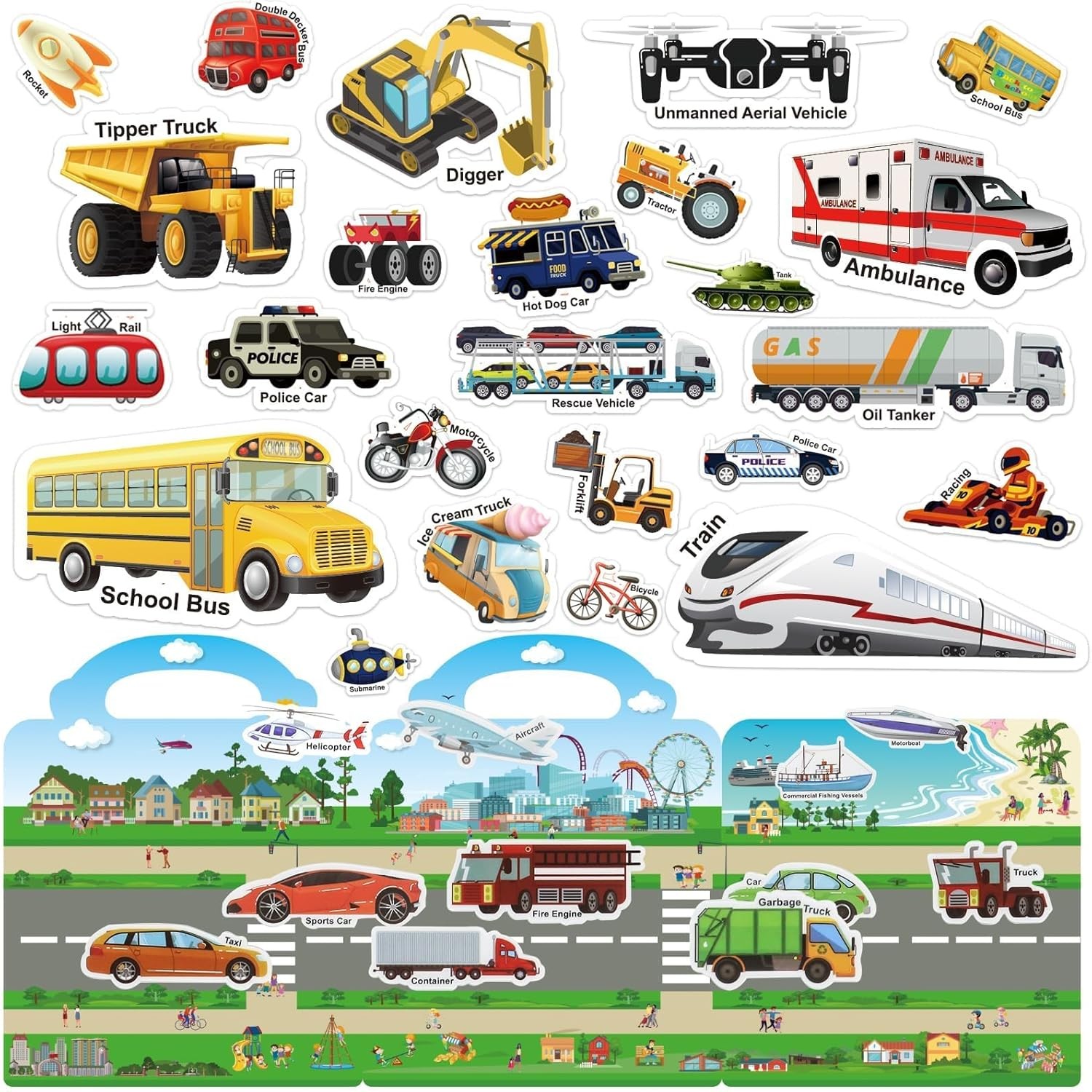 210 PCS Vehicles Reusable Sticker Books for Kids 2-4, 6 Sheets Reusable Sticker