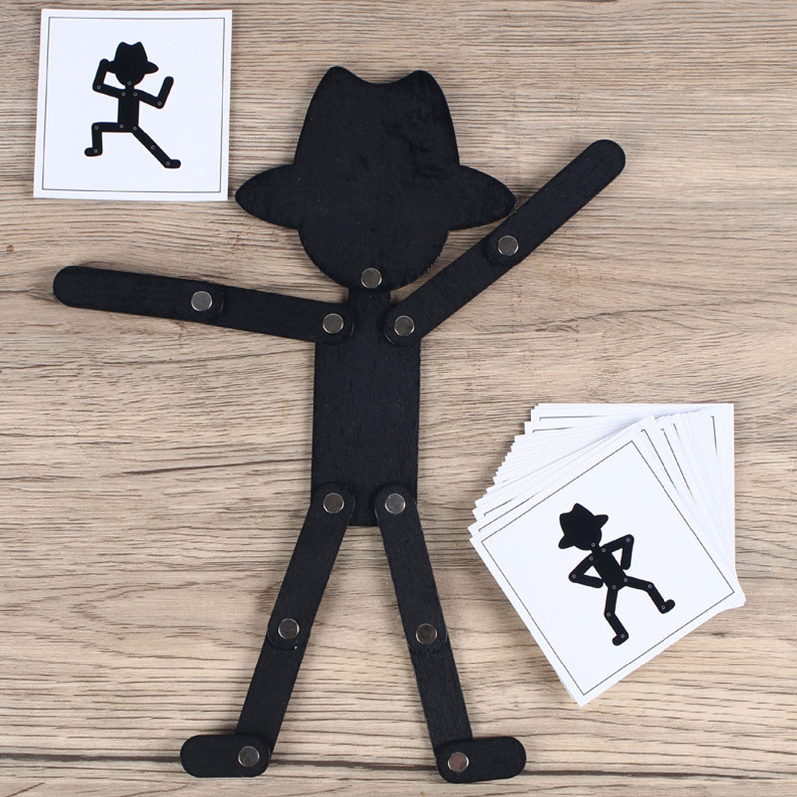 Educational Wooden Stickman Toy with Moving Limbs, 10-Card Puzzle Game