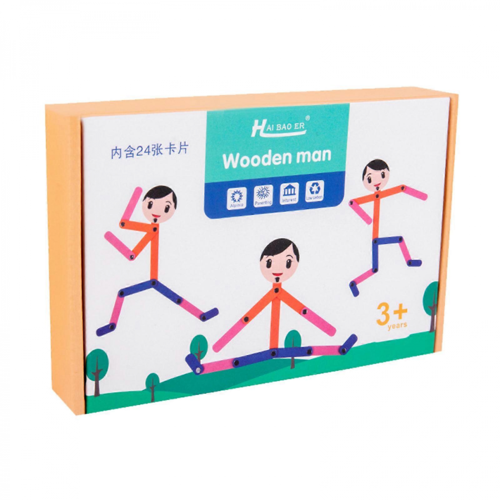 Sturdy Wood Stickman Toy with Flexible Limbs and 24 Educational Cards